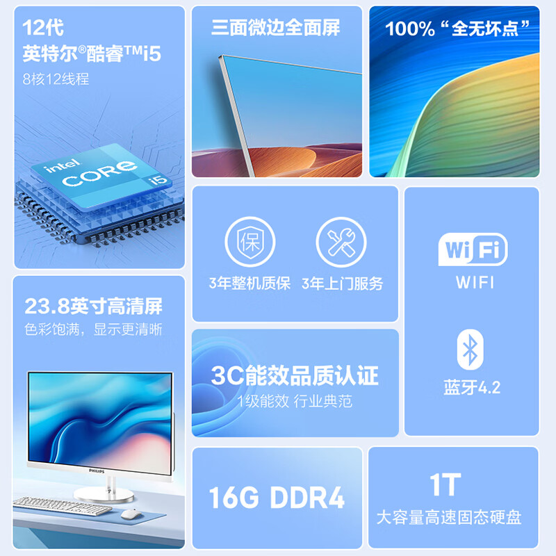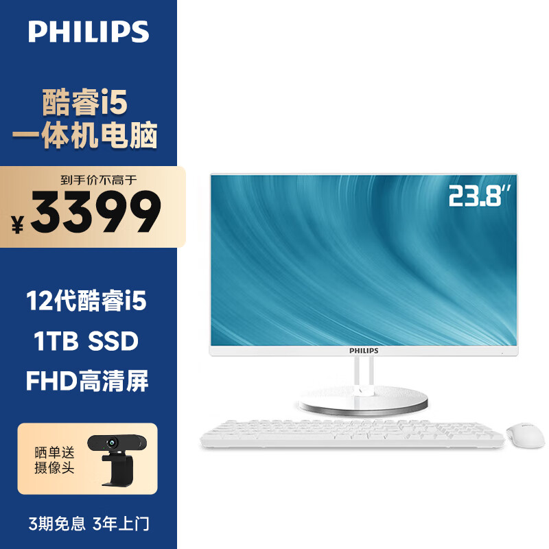 飞利浦S9 23.8英寸台式一体机电脑主机 家用网课八核办公整机(12代i5 12450H 16G 1TB SSD 双频WiFi)白色价格:3399.00元!