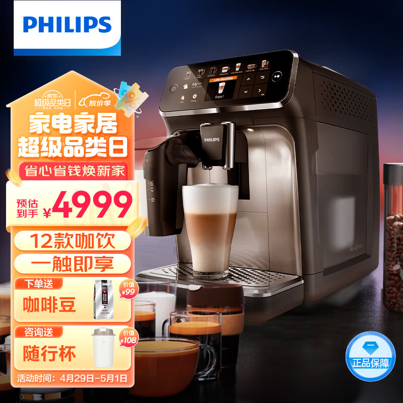 飞利浦(PHILIPS)云朵咖啡机5系EP5144/92 意式全自动浓缩家用/办公奶泡咖啡机LatteGo牛奶研磨一体系统价格:4999.00元!