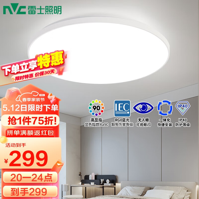 雷士(NVC)LED吸顶灯现代简约卧室书房餐厅灯Ra90高显色IP40防护 如玉36w价格:398.00元!