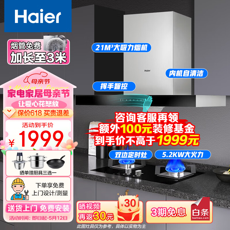 海尔(Haier)抽油烟机燃气灶套装 欧式顶吸自清洁挥手开关 21m3大吸力吸油烟机家用ET912烟灶套装5.2KW灶[家电]价格:2199.00元!
