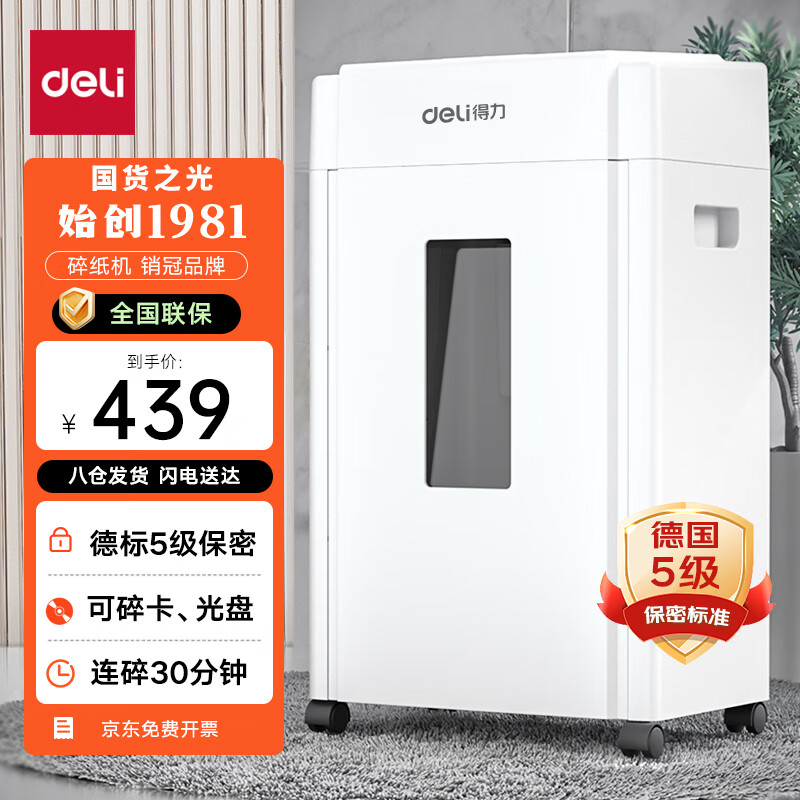 得力5级保密碎纸机33040 旗舰双碎口 商用办公大型碎纸机 文件粉碎(单次8张 可碎光盘 20L 30分钟)价格:479.00元!