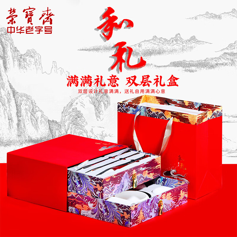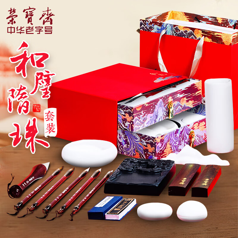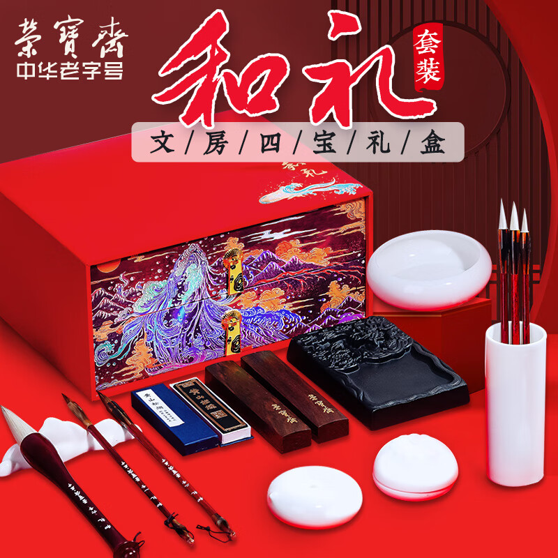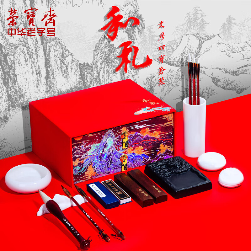 荣宝斋文房四宝套装红色双层年货礼盒送礼兼毫毛笔套装墨汁墨锭印泥镇尺瓷器笔筒水洗 和礼文房四宝礼盒价格:799.00元!