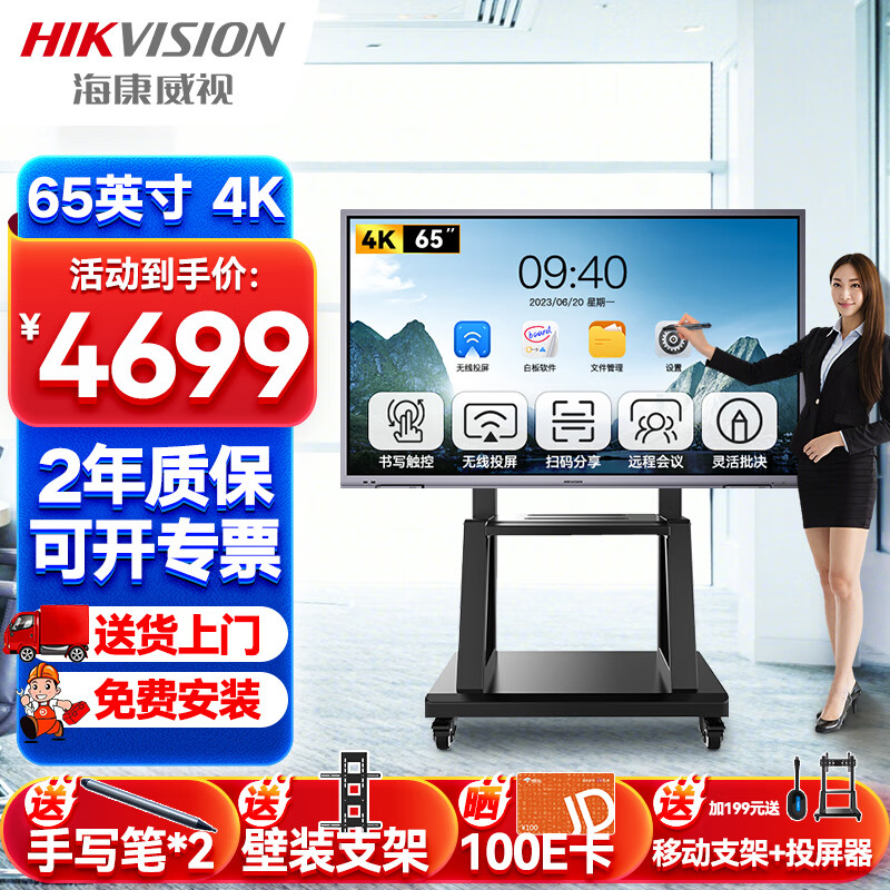 HIKVISION海康威视会议平板一体机65英寸视频会议电子白板触屏教学办公会议大屏4K防炫屏安卓11系统4核CPU价格:4699.00元!