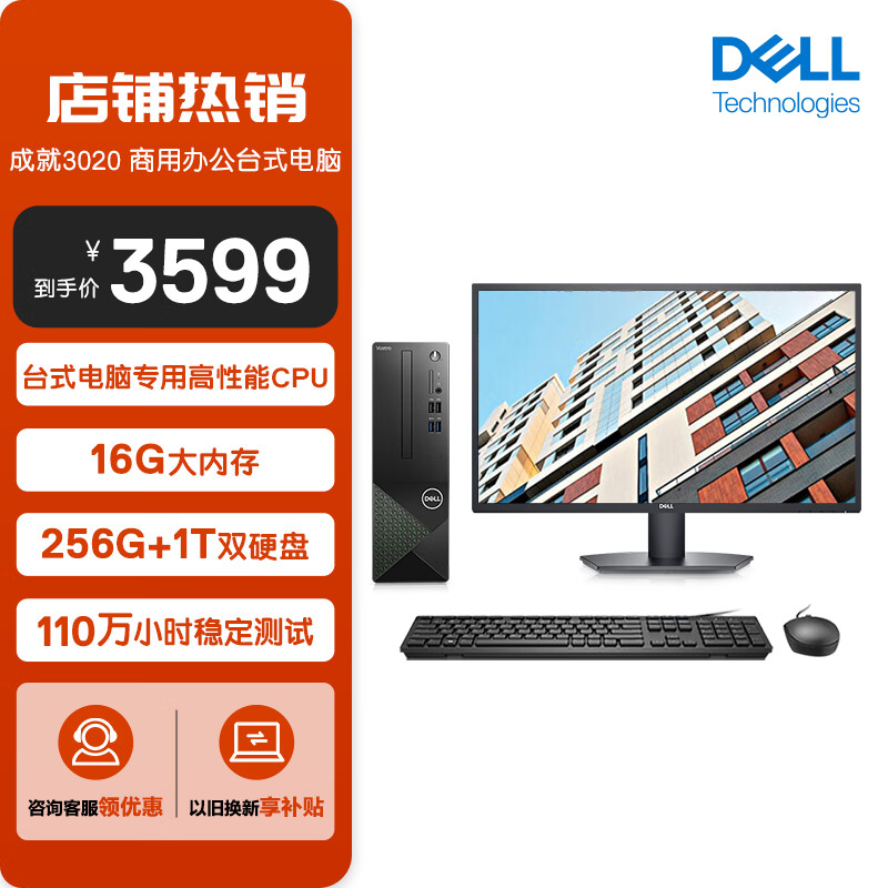 戴尔(Dell)成就3020 台式电脑主机(酷睿13代i3-13100 16G 256GSSD+1TB)27英寸大屏显示器 高性能CPU价格:3599.00元!