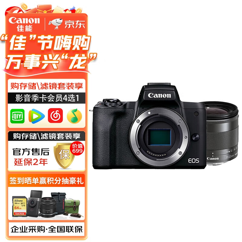 佳能(Canon)EOS M50 Mark II M50二代单机身+EF-M 11-22mm F4-5.6 IS STM镜头微单数码相机 黑色 64G套装价格:8954.00元!