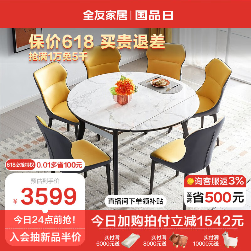 全友家居 现代轻奢岩板餐桌椅餐厅家具可方可圆伸缩折叠餐桌DW1059价格:5141.43元!