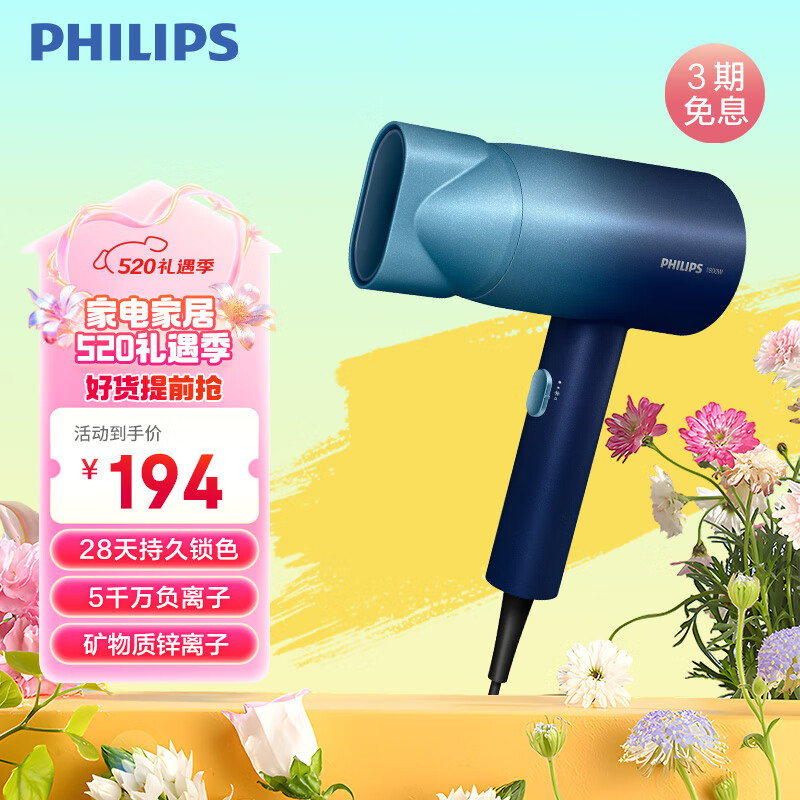 飞利浦(PHILIPS)电吹风机 3系炫色筒 锌离子防晒护色 5000万负离子 烫染修复 星空蓝价格:194.00元!