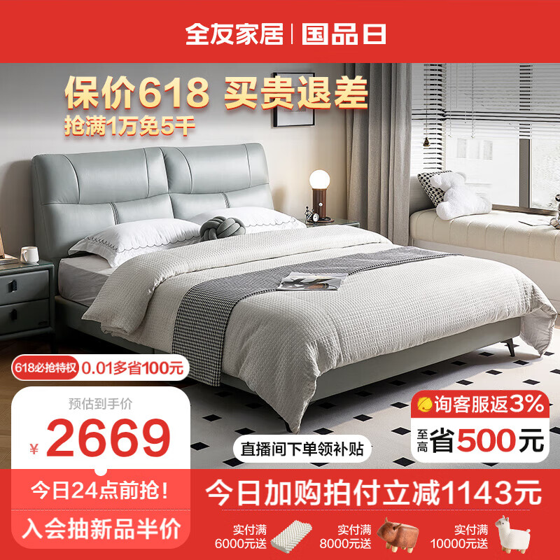 全友家居 真皮艺床现代轻奢主卧室头层牛皮双人大床1.8x2米家具105201价格:3812.86元!