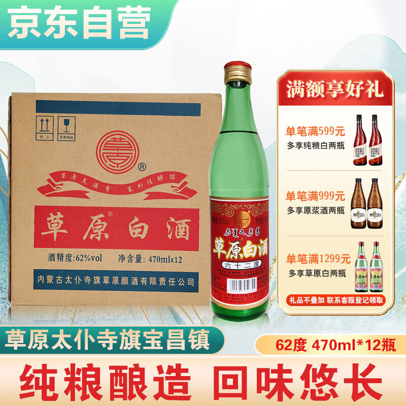 草原 纯粮酿造口粮酒 清香型高度光瓶白酒 62度 470ml*12瓶 泡药酒价格:339.00元!