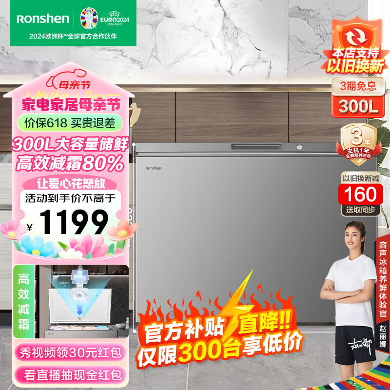 容声(Ronshen)300升大容量减霜冰柜家商两用冷藏冷冻转换单温一级能效节能省电低噪卧式冷柜 300L新品大容量减霜冷柜价格:1199.00元!