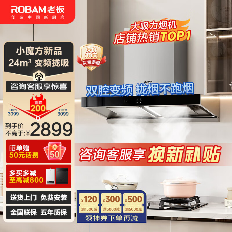 老板(Robam)【领航家】 抽油烟机燃气灶 双腔24风量大吸力 欧式新款静音变频免拆洗 60X6S 单烟机价格:2899.00元!