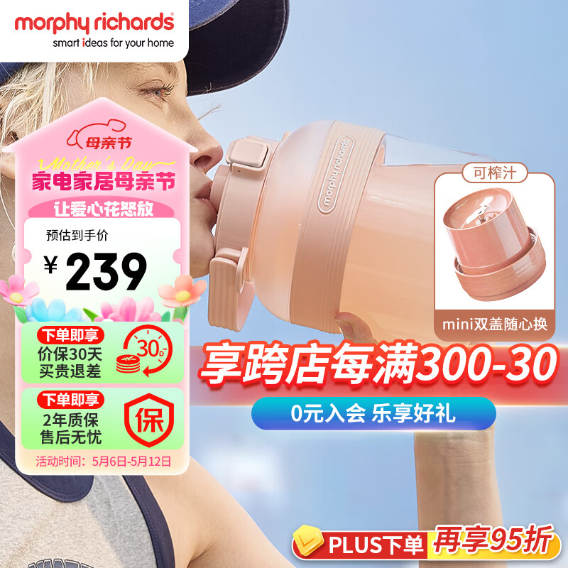 摩飞电器(Morphyrichards)榨汁机 榨汁桶便携榨汁杯无线充电果汁杯随行杯1升容量户外果茶冷泡桶迷你小胖吨MR9805 Nano版 粉价格:239.00元!