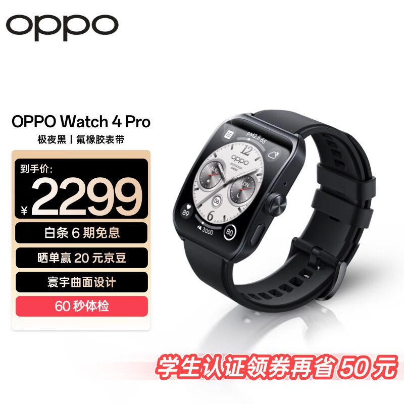 OPPO Watch 4 Pro 极夜黑 全智能手表 运动健康手表男女eSIM电话手表 心电图心率血氧监测 一加价格:2299.00元!