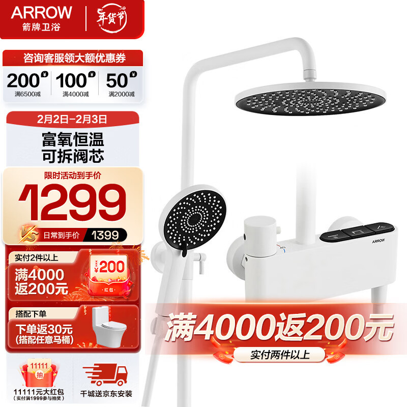 箭牌(ARROW)白色恒温花洒 淋浴套装三功能卫浴加压富氧淋雨器 AE33150HWP价格:1619.00元!