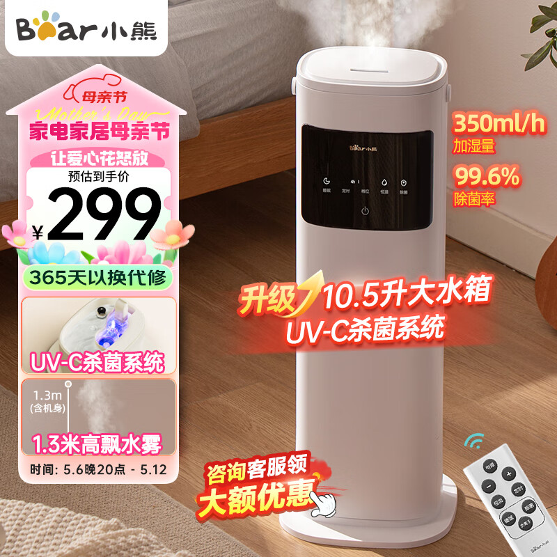 小熊(Bear)加湿器卧室轻音婴儿办公室客厅落地式上加水空气加湿器大雾量UV除菌10.5L巨量生日礼物JSQ-C99A1价格:349.00元!