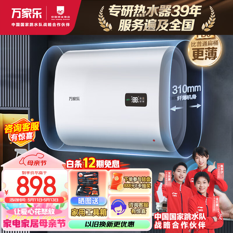 万家乐电热水器扁桶50升储水式2100W速热 WiF智控 高温杀菌 M型活水D50-FB0价格:1098.00元!