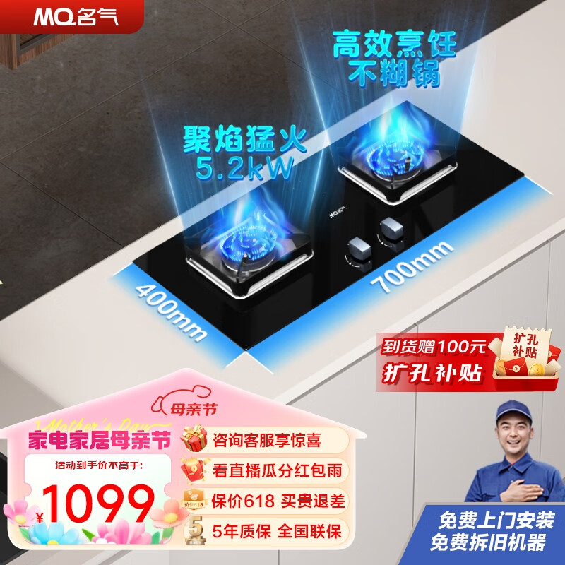 名气(MQ)老板家用液化气燃气灶 升级5.0KW大火力猛火灶 嵌入式灶具 64%热效率 双灶煤气灶 JZY-A6812B价格:1099.00元!