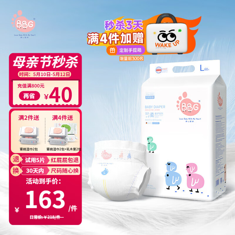 BBG蓝芯羽柔奢护纸尿裤XL50片(11-14kg)婴儿尿不湿鲸吸瞬干不易漏价格:198.00元!