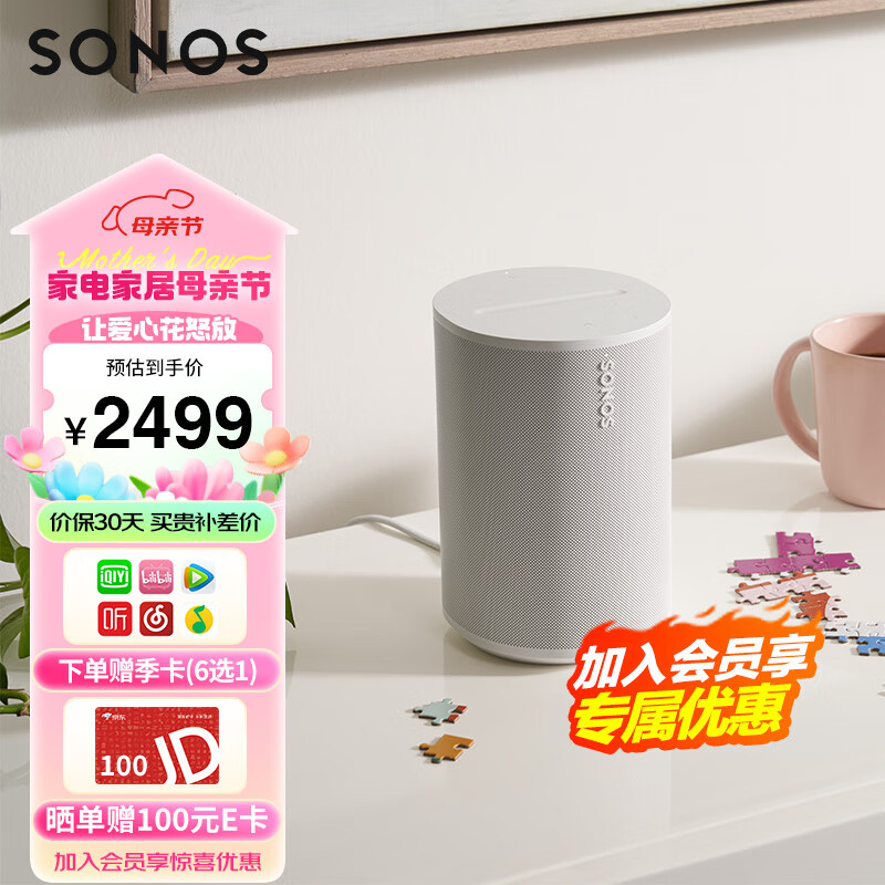SonOS Era100 WIFI无线蓝牙 环绕可组合 家庭影院 迷你音响 One升级版 家用桌面客厅卧室书架 白色价格:2499.00元!