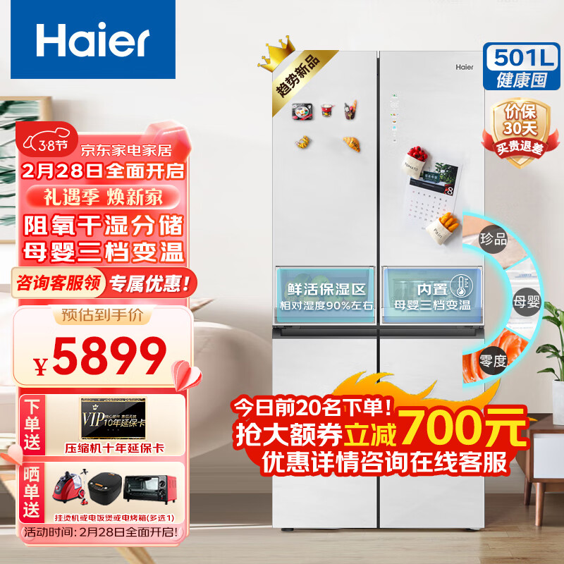 海尔(Haier)冰箱501升 十字四开门一级双变频风冷无霜 EPP多重净化母婴三档变温 BCD-501WGHTD95GQU1价格:6199.00元!