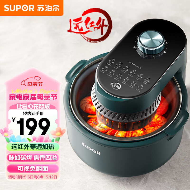 苏泊尔(SUPOR)空气炸锅 家用4L大容量可视 不用翻面 低油轻脂薯条机 远红外穿透加热电炸锅 KJ40D850价格:194.00元!