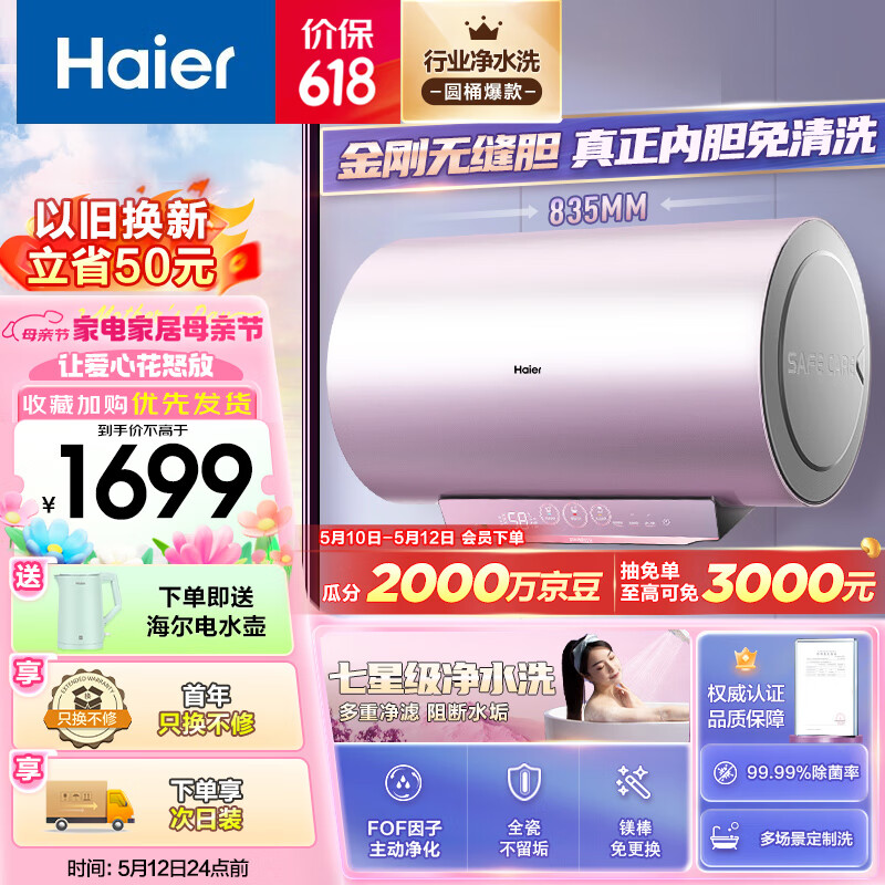 海尔(Haier)80升【金刚无缝胆】美肤净水洗家用储水式电热水器3300W变频大功率速热免换镁棒WiFi EC8002-MG7U1价格:1799.00元!