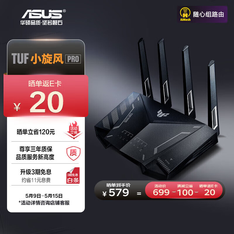 华硕(ASUS)TUF小旋风Pro全千兆电竞无线路由器/穿墙全屋WiFi6/双2.5G口/Ai路由器价格:699.00元!