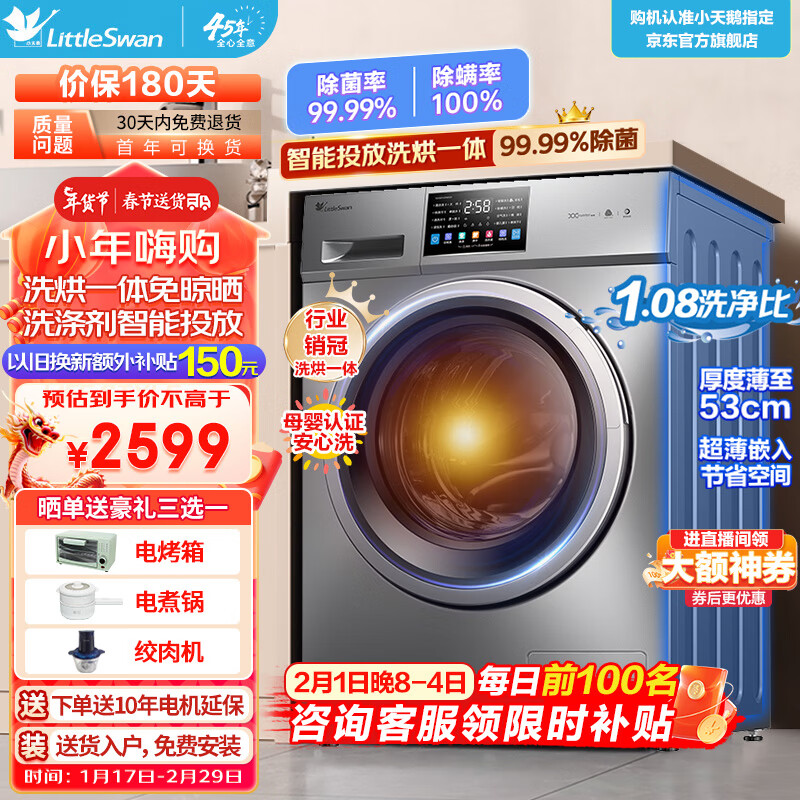 小天鹅(LittleSwan)洗衣机10公斤全自动滚筒洗烘彩屏智能投放除螨空气洗羽绒服洗母婴1.08高洗净比超薄以旧换新洗衣机 【升级款 彩屏智投快洗烘】TD100V23WIDY价格:2599.00元!