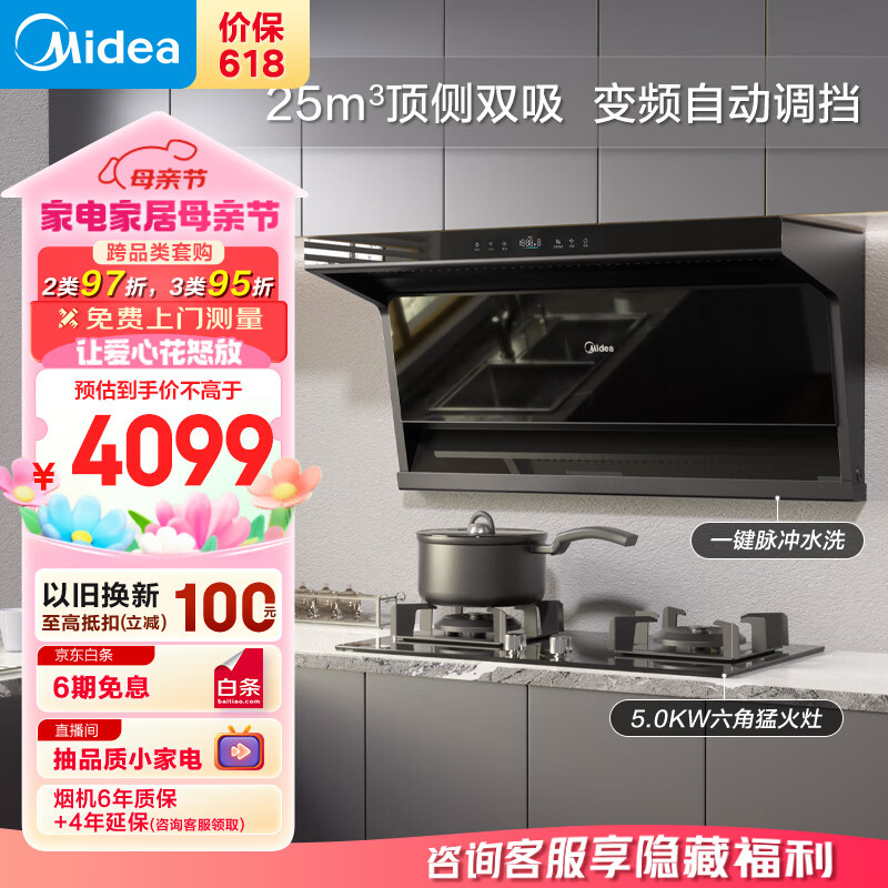 美的(Midea)抽油烟机燃气灶具套装?家用顶侧双吸25风量大吸力变频烟感 5.0kW燃气灶 烟灶套装DC9+Q70A天然气价格:4099.00元!