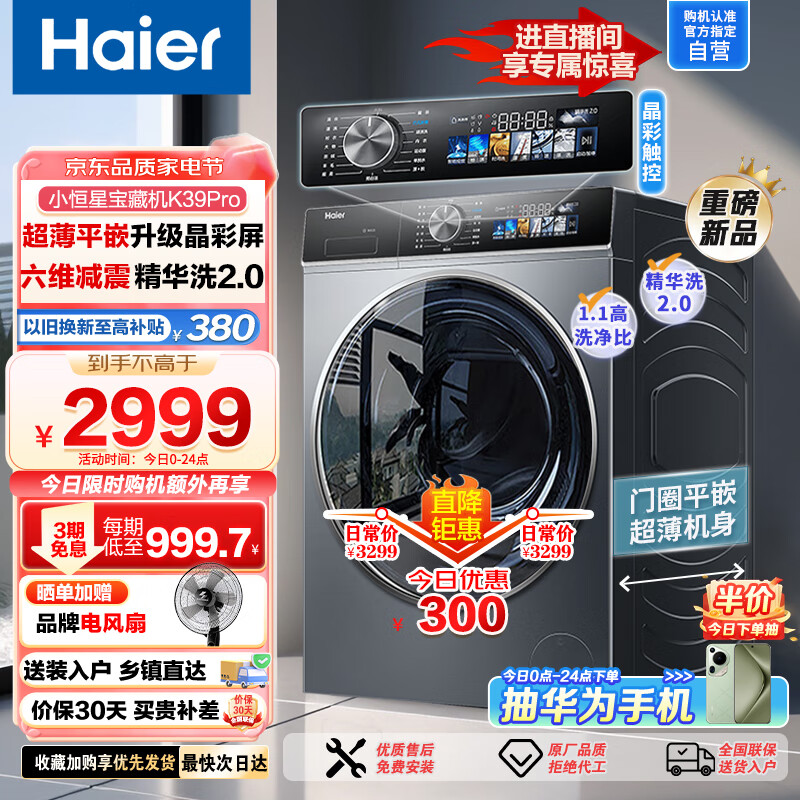 海尔(Haier)小恒星精华洗2.0全自动滚筒洗衣机K39Pro 10公斤大容量超薄平嵌智能投放六维减震1.1洗净比12519价格:2999.00元!