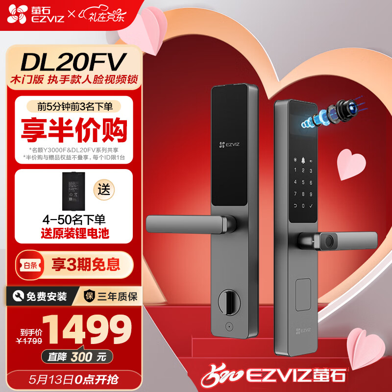 萤石DL20FV智能人脸视频锁 木门版标准锁 3D人脸识别指纹握开式视频锁 家用全自动猫眼门铃电子门锁价格:1499.00元!