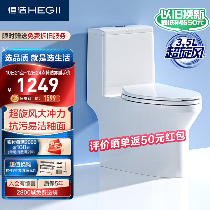 恒洁(HEGII)马桶561 超旋风大冲力虹吸式家用节水坐便器HC0561DT-400价格:1509.00元!
