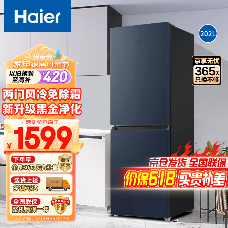 海尔(Haier)202升二门双门冰箱风冷无霜超薄净味小型家用租房电冰箱节能省电小冰箱价格:1599.00元!