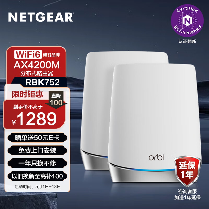 网件(NETGEAR)RBK752大户型Mesh组网路由器全屋wifi套装/无线千兆子母路由wifi6/四核三频/AX4200/Orbi/认证翻新价格:1389.00元!
