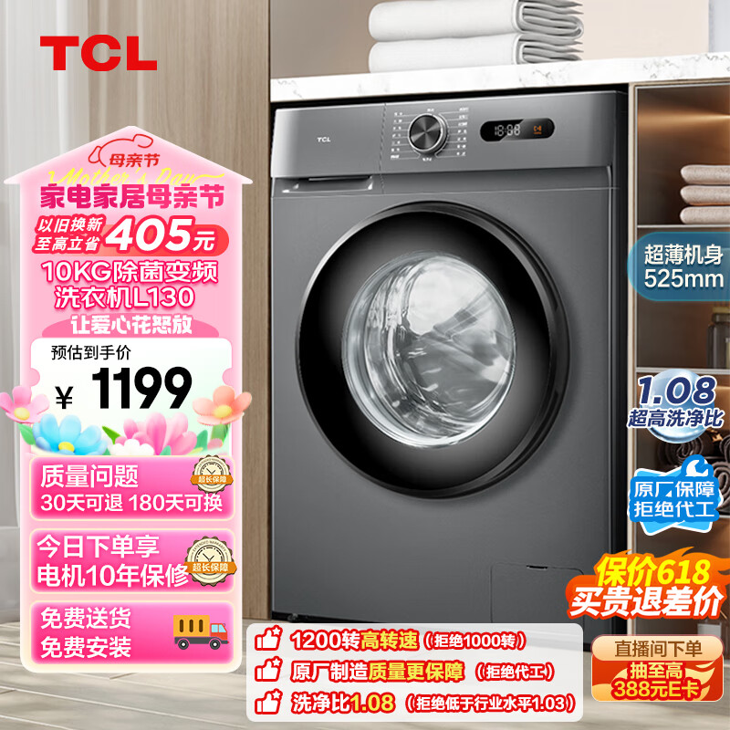 TCL 10KG除菌变频滚筒洗衣机 L130 巴氏除菌 高洗净比1.08 超薄嵌入 全自动洗衣机 G100L130-B价格:1199.00元!