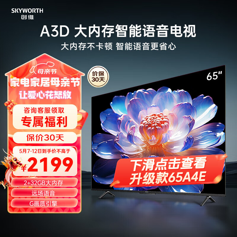 创维电视65A3D 65英寸电视 2+32GB大内存 远场语音 4K高清智慧屏 超薄液晶平板电视机 以旧换新 65英寸价格:2019.00元!