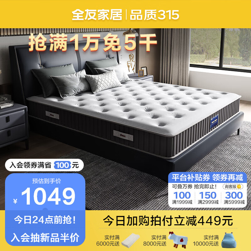 全友家居 乳胶床垫 软硬两用 五区独袋弹簧床垫105169价格:1498.57元!