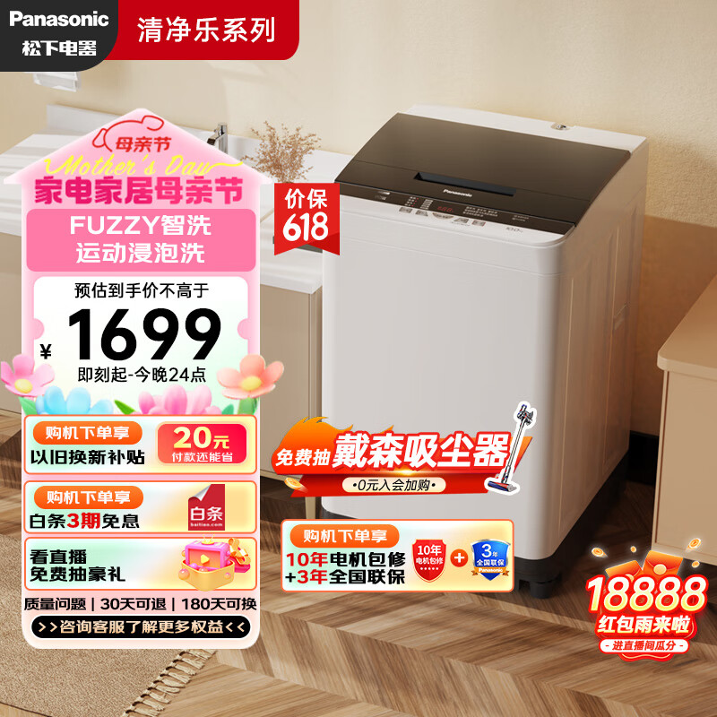 松下(Panasonic)波轮洗衣机全自动 清净乐系列10公斤大容量 线屑过滤 桶自洁免清洗耐脏 以旧换新XQB100-8Q1A价格:1699.00元!