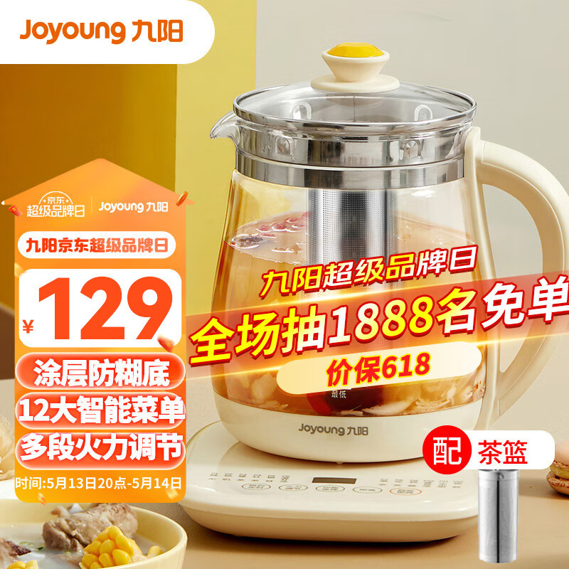 九阳(Joyoung)养生壶玻璃花茶壶 12大功能 1.5L专注炖煮 防糊底 电热水壶 K15F-WY175(茶)价格:129.00元!