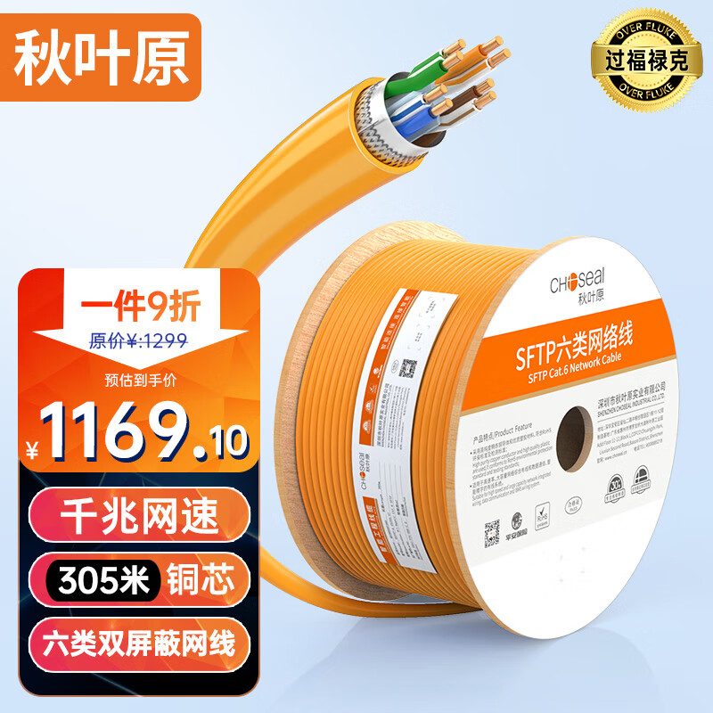 秋叶原(CHOSEAL)六类双屏蔽网线【商用版】抗干扰千兆铜线箱线橙色305米 QS2605T305价格:1299.00元!