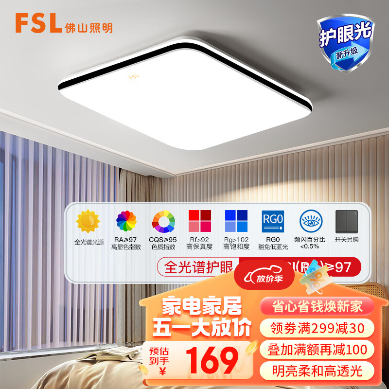 FSL佛山照明全光谱护眼吸顶灯高亮调色卧室灯低蓝光Ra97悦夕36W方价格:299.00元!