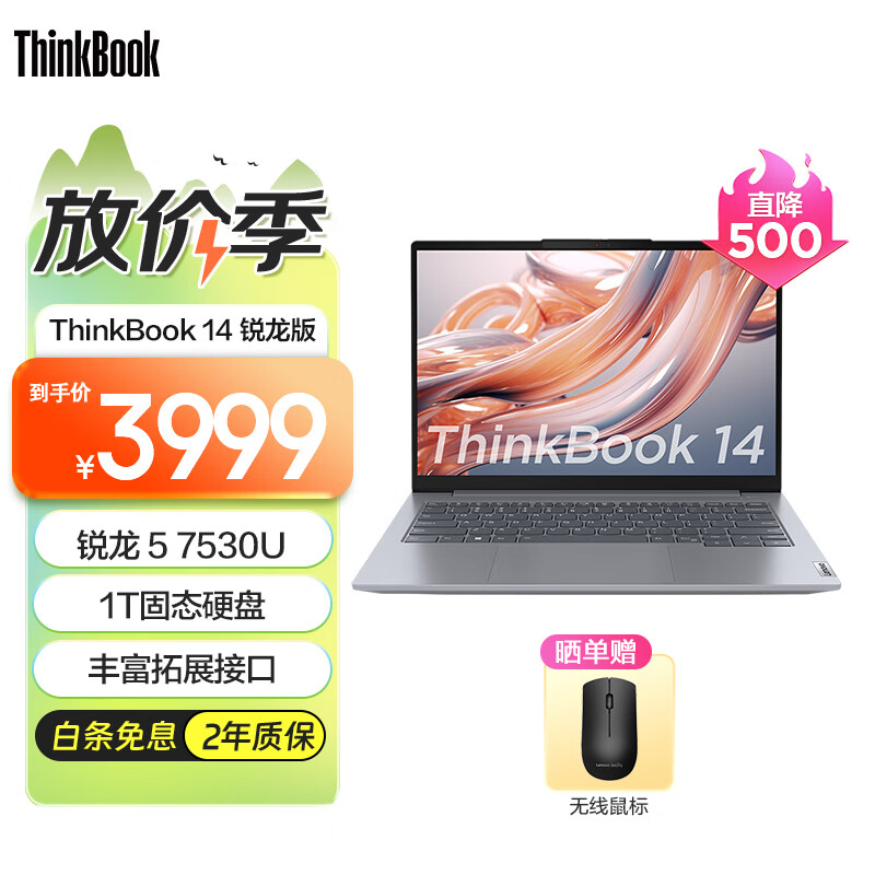 ThinkPad联想ThinkBook 14/16锐龙版 商务轻薄笔记本电脑 14英寸:R5-7530U 16G 1T 23CD价格:3999.00元!