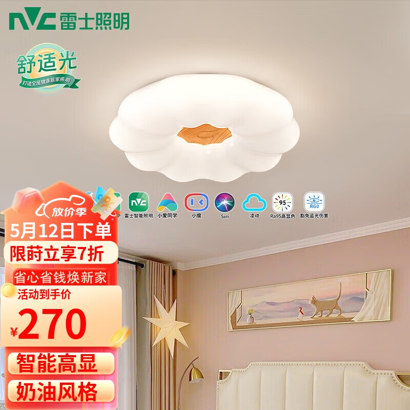 雷士(NVC)led吸顶灯卧室儿童房灯具原木奶油风智能舒适光WHXD24F/F-06价格:385.00元!