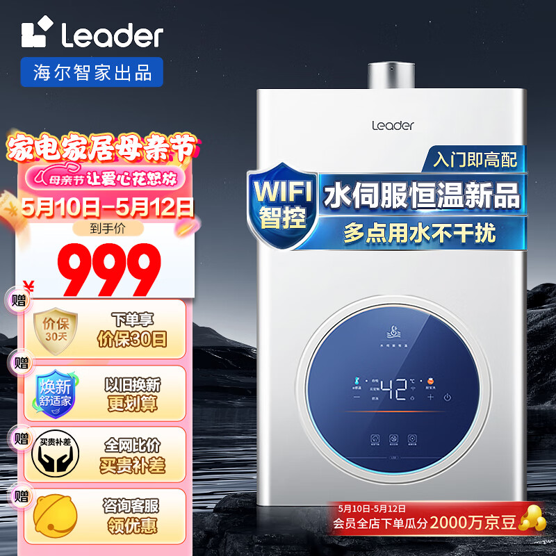 海尔(Haier)智家出品 Leader16升燃气热水器天然气水伺服恒温AI家用智能节能 JSQ30-16LS3U1价格:999.00元!