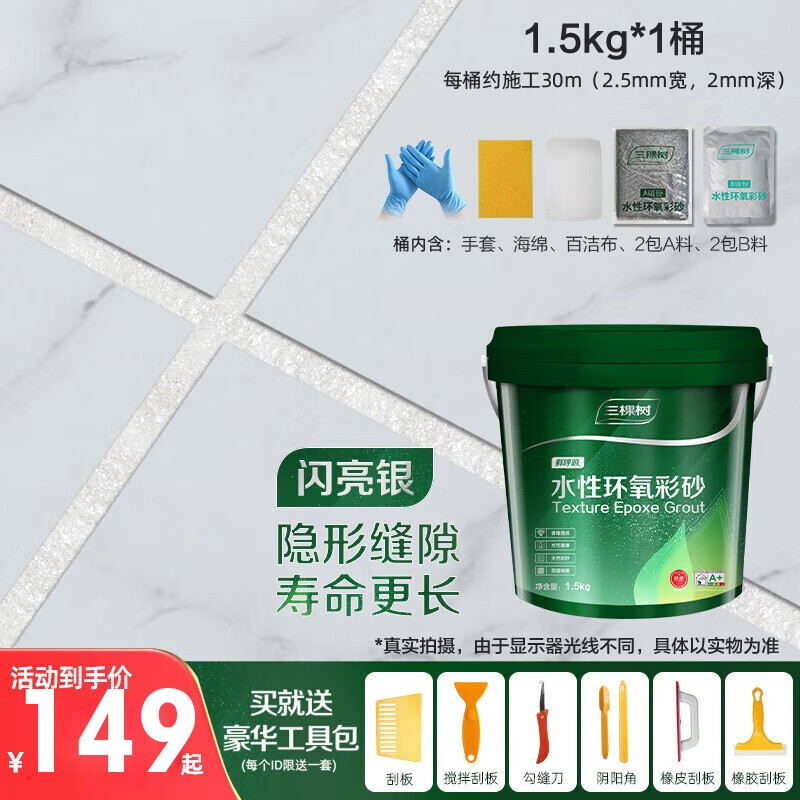 三棵树漆(SKSHU)水性环氧彩砂桶装美缝剂耐磨耐水客厅厨卫地砖瓷砖胶 闪亮银价格:149.00元!