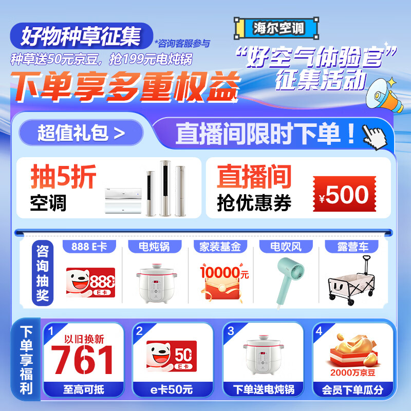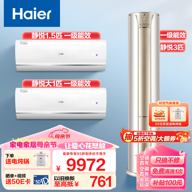 海尔(Haier)空调 套装二室一厅(大1匹静悦一级挂机+1.5匹静悦一级挂机+3匹静悦一级能效柜机)套购价格:9972.00元!