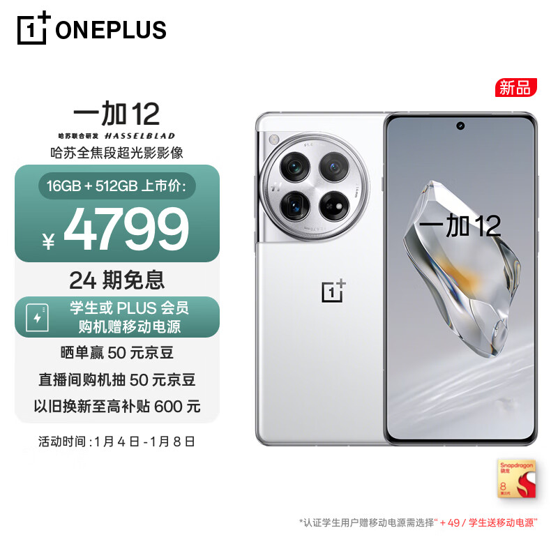 OPPO 一加 12 16GB+512GB 留白 哈苏全焦段超光影影像 2K 东方屏 第三代高通骁龙 8 旗舰芯片 5G游戏旗舰手机价格:4799.00元!