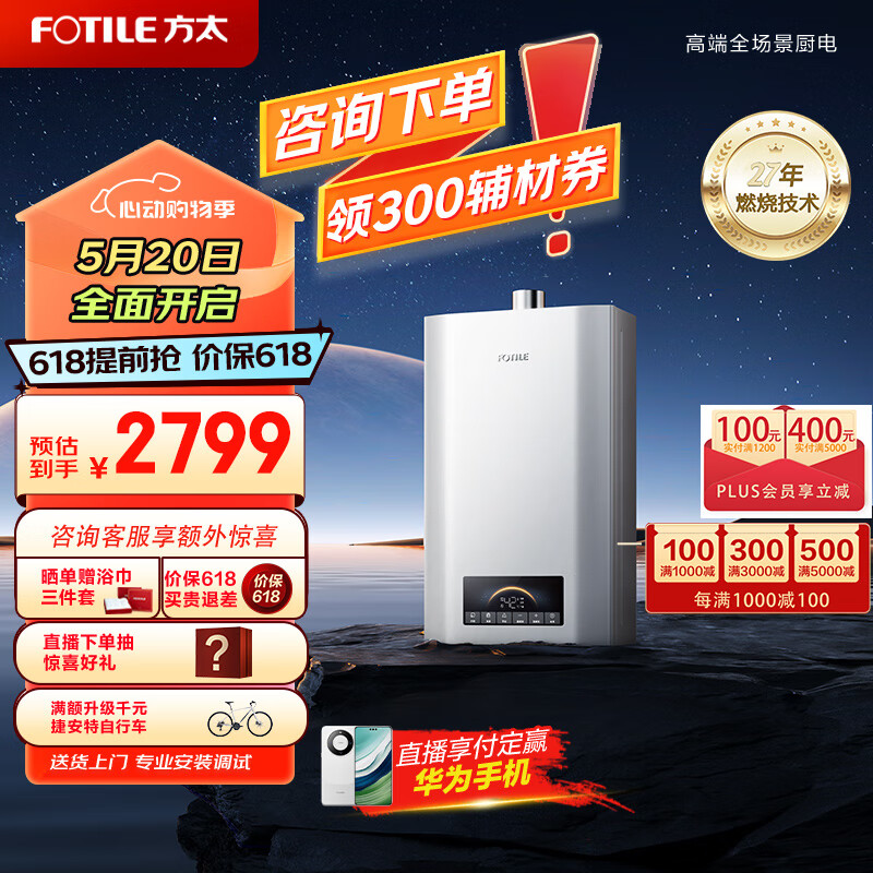 方太(FOTILE)16升天然气家用燃气热水器 旁通混水 水伺服变频恒温沐浴洗 负压增氧智能防冻热水器S16D1-FR-12T价格:2999.00元!