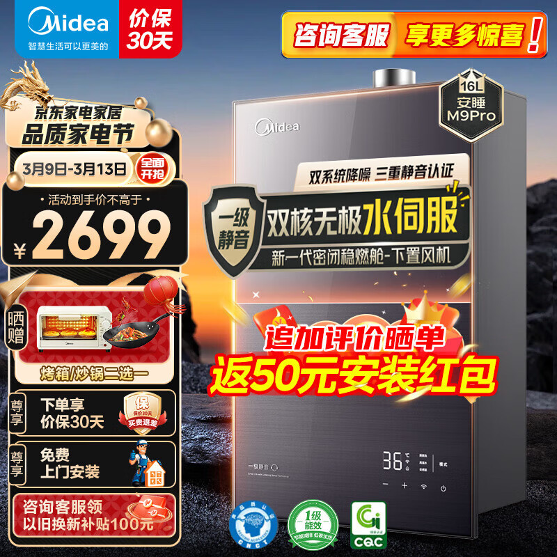 美的(Midea)安睡M9系列16升燃气热水器 天然气 一级静音2.0变频水伺服 四段微火恒温 密闭稳燃舱JSQ30-M9 Pro价格:2699.00元!