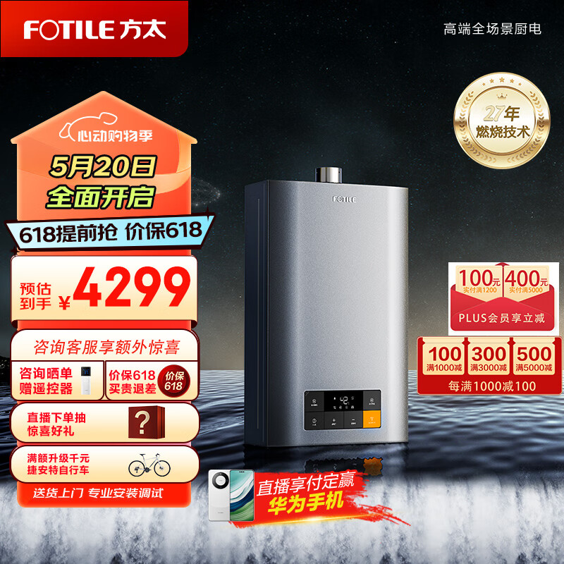 方太16升天然气燃气热水器 家用强排式 智能变频恒温 双增压零冷水瀑布洗 防冻款JSQ30-X16D2价格:4699.00元!